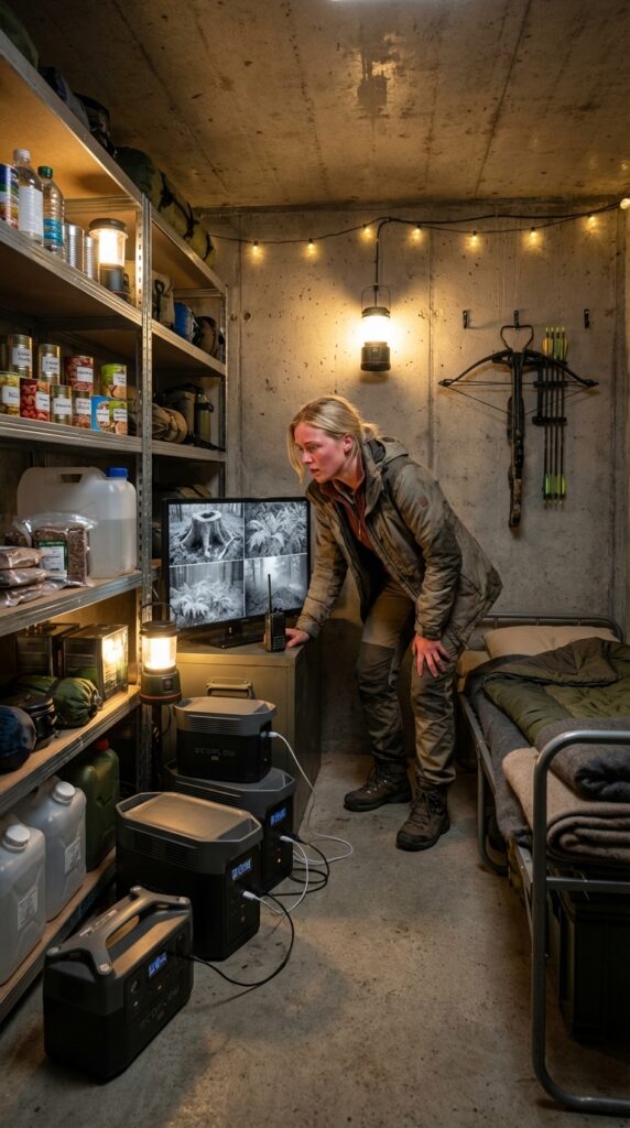 When the hatch opens, a narrow staircase leads down into the underground bunker constructed from reinforced concrete. The bunker is designed with several functional areas that support long-term survival. One section contains the main living and storage room, where shelves hold canned food, water containers, medical kits, and essential survival equipment. Portable power stations provide electricity for lighting, communication devices, and other electronics inside the bunker.