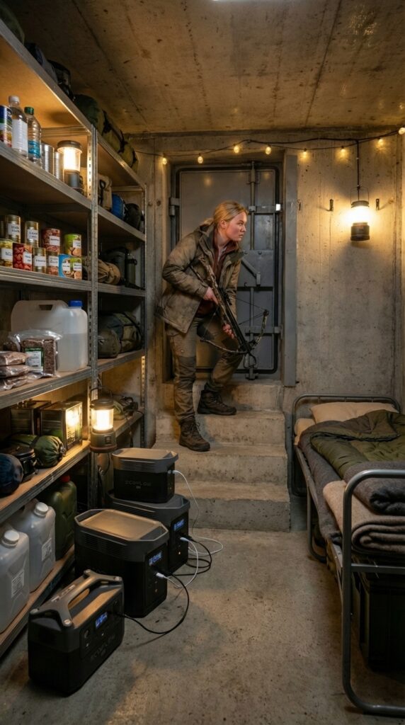 On one side of the room, strong metal shelving units hold carefully organized survival supplies. Rows of canned food, dry rations, bottled water, medical kits, and emergency equipment are stored neatly along the wall. Large water containers and fuel canisters are placed on the lower shelves, ensuring easy access while keeping the space organized. Portable power stations are positioned on the floor to provide electricity for lighting, communication devices, and essential electronics.