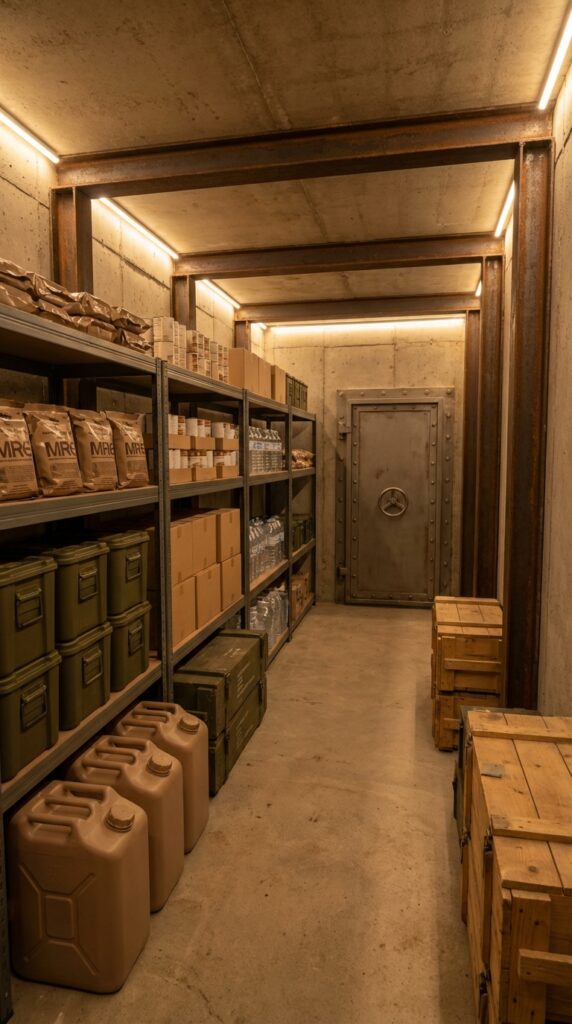 This section of the bunker is dedicated to long-term storage and essential resources. Metal shelves are fully stocked with food supplies, sealed water containers, equipment boxes, and survival gear.