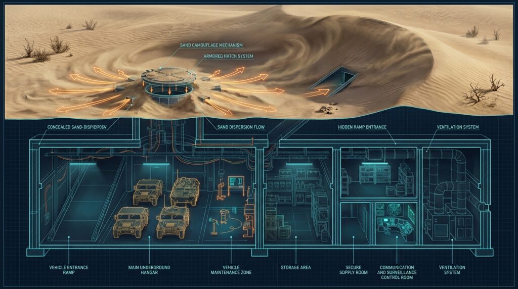 Beneath the sand, the structure expands into a large underground facility designed for vehicles, storage, and operational use. From the outside, however, it remains nothing more than a natural desert formation.