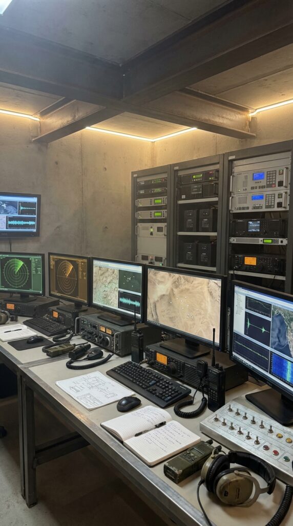 This control room is the central hub of the entire bunker. Equipped with multiple monitoring screens, radar systems, and communication equipment, it provides full visibility over the surrounding desert.