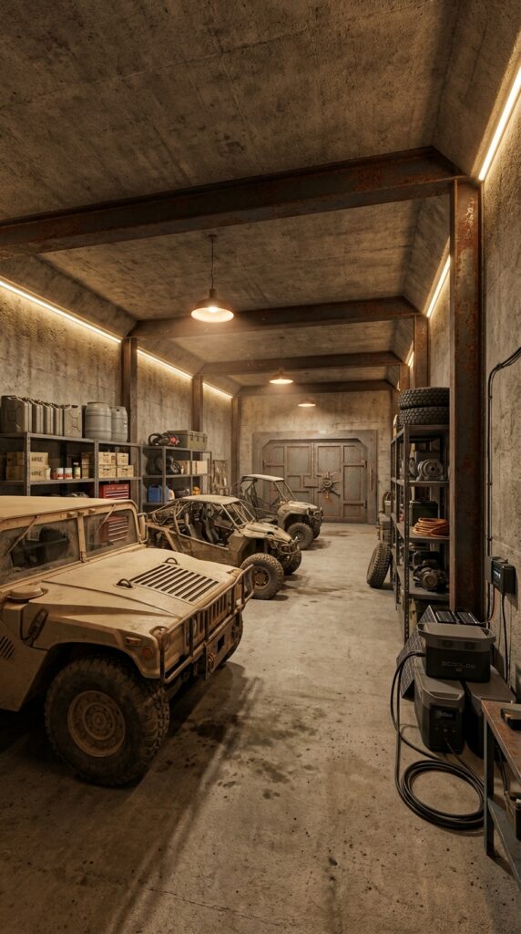 This underground garage is designed to store and maintain off-road vehicles used for desert movement. Several military-style vehicles are parked inside, ready for immediate deployment.