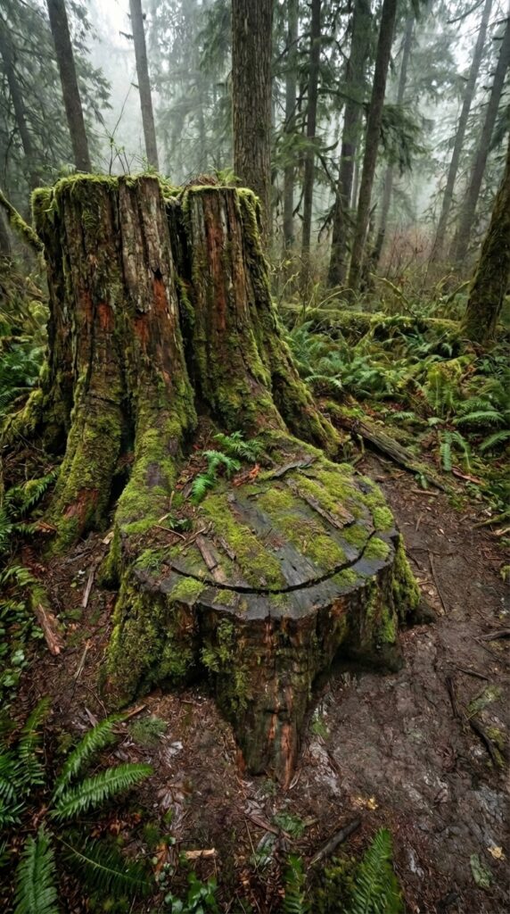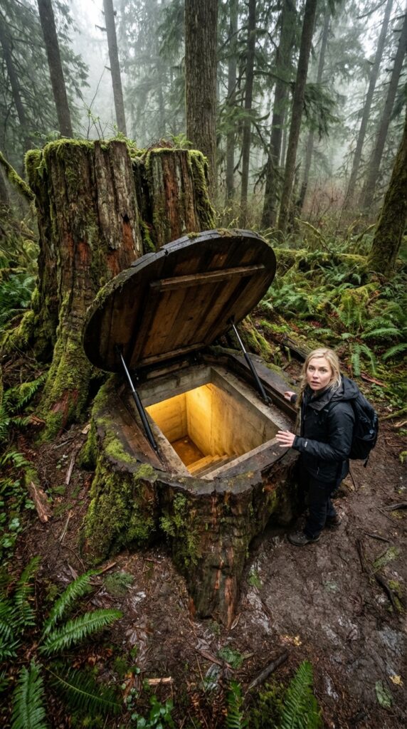Deep within a dense and misty forest, this unique underground bunker is hidden beneath what appears to be an ordinary tree stump. Covered in moss, roots, and natural decay, the entrance blends perfectly into the environment, making it nearly impossible to detect even at close range.