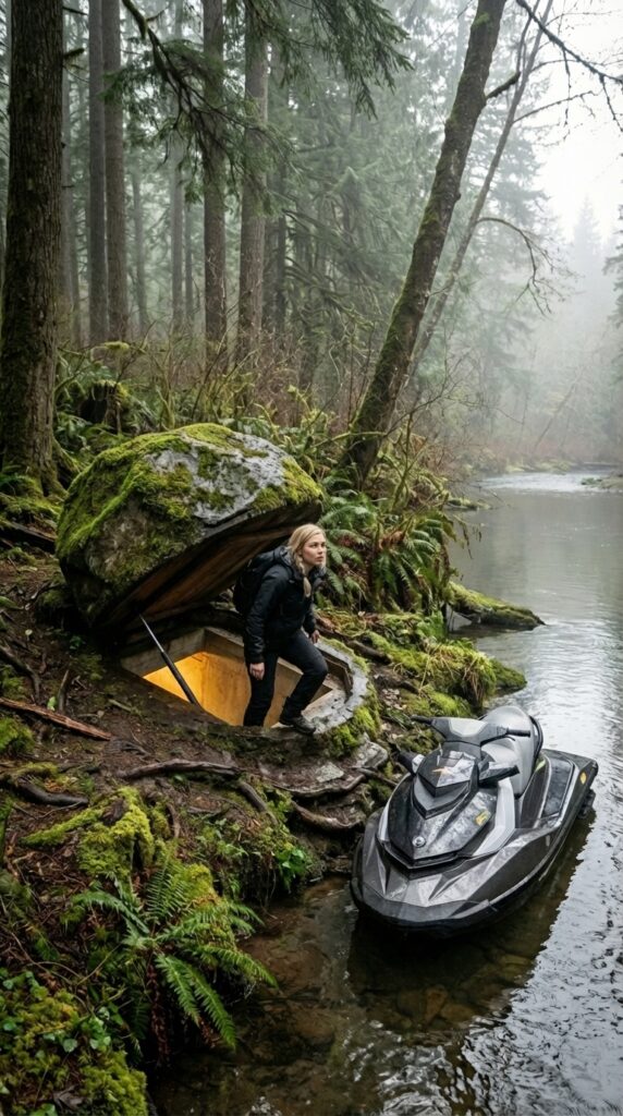 The secondary exit is concealed beneath a moss-covered rock at the riverbank, blending seamlessly into the natural surroundings. Nearby, a high-performance jet ski is kept ready at all times, providing a fast and silent way to escape using the river as a natural route.
