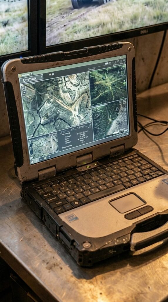 A rugged laptop displays detailed terrain maps and live data feeds, while external screens provide real-time visual coverage of key routes. Every movement is tracked, analyzed, and monitored with precision.