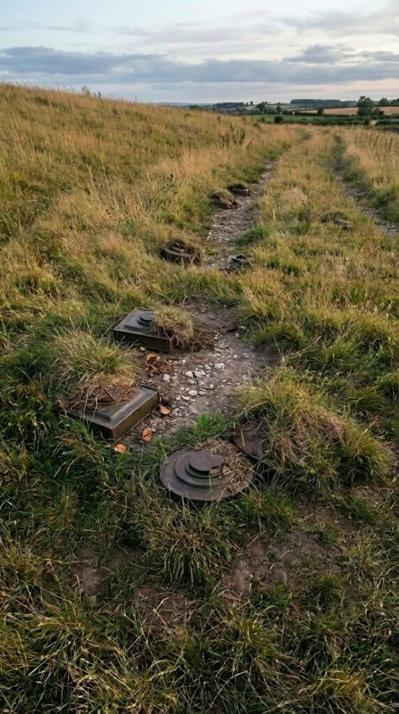 This seemingly quiet dirt path hides a serious and invisible threat. The ground is marked by hazardous devices partially concealed beneath grass and soil, turning an ordinary route into a highly dangerous zone.
