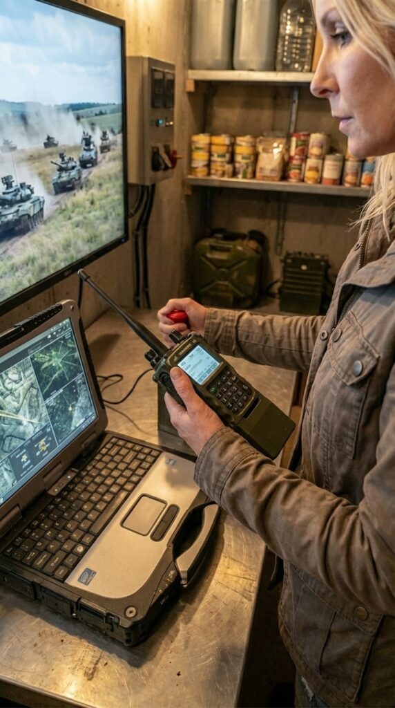 In her hands, a secure radio unit ensures constant communication, allowing coordination and rapid response when needed. The setup is built for reliability, giving her complete control even in isolated conditions.
