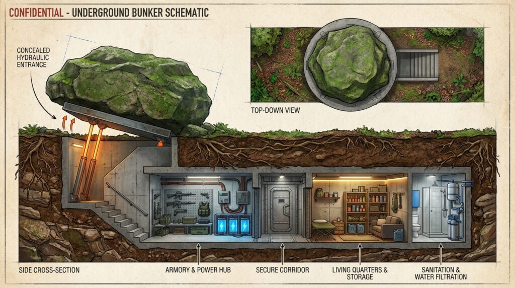 This underground bunker is designed as a fully concealed and self-sufficient survival space, hidden beneath a massive natural rock and integrated seamlessly into the surrounding landscape.