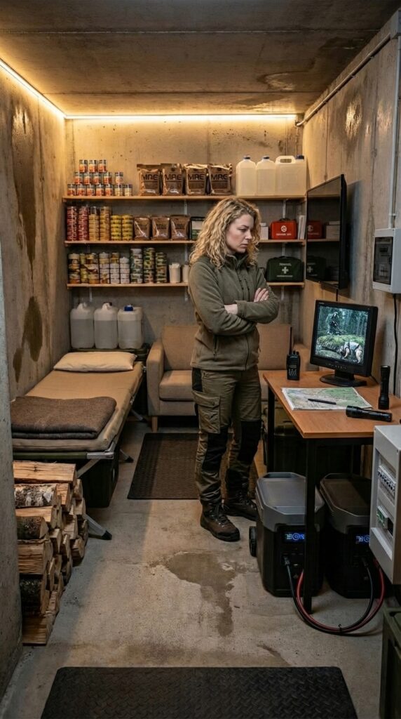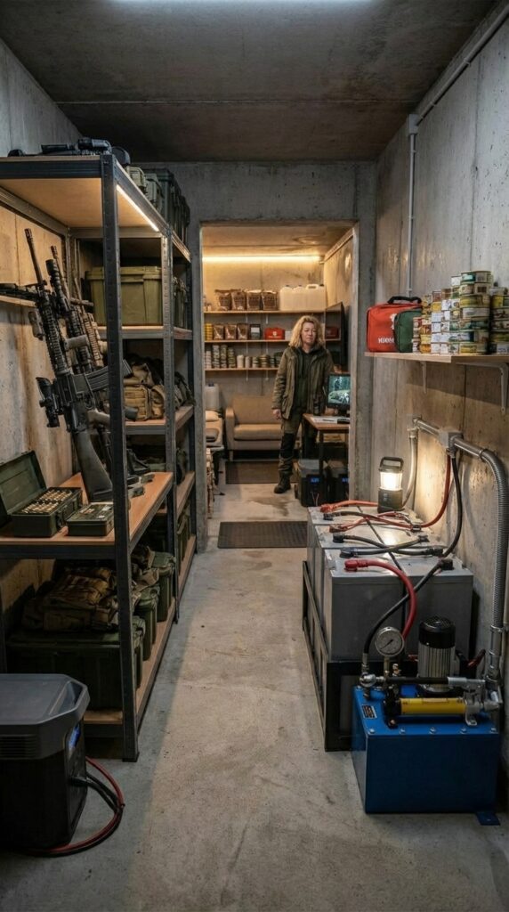 Shelving along the walls is stocked with essential supplies — preserved food, water containers, and medical kits — ensuring long-term sustainability without the need to leave the shelter. The setup supports a fully off-grid lifestyle, where everything needed is within reach.