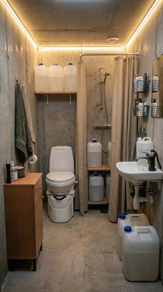 A compact toilet setup is paired with additional water storage, allowing continuous use without any external supply. The sink provides basic hygiene functionality, while storage baskets keep essential items organized and easily accessible.