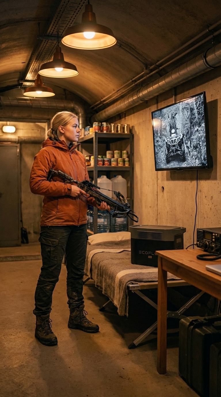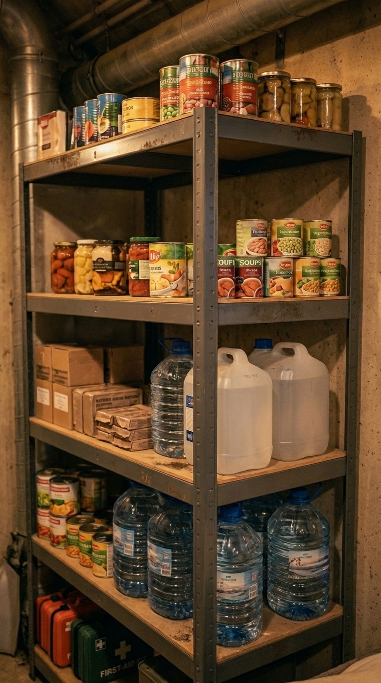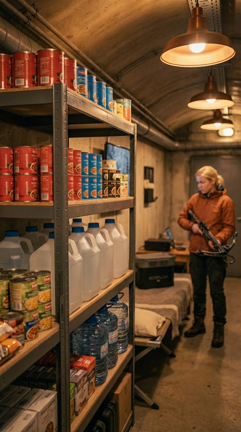 A well-equipped bunker relies on a carefully planned supply system designed for long-term survival and full independence. The storage area is organized with durable metal shelving, allowing efficient use of space while keeping all essential resources easily accessible. Supplies are categorized and stacked for quick identification, ensuring readiness in any situation.