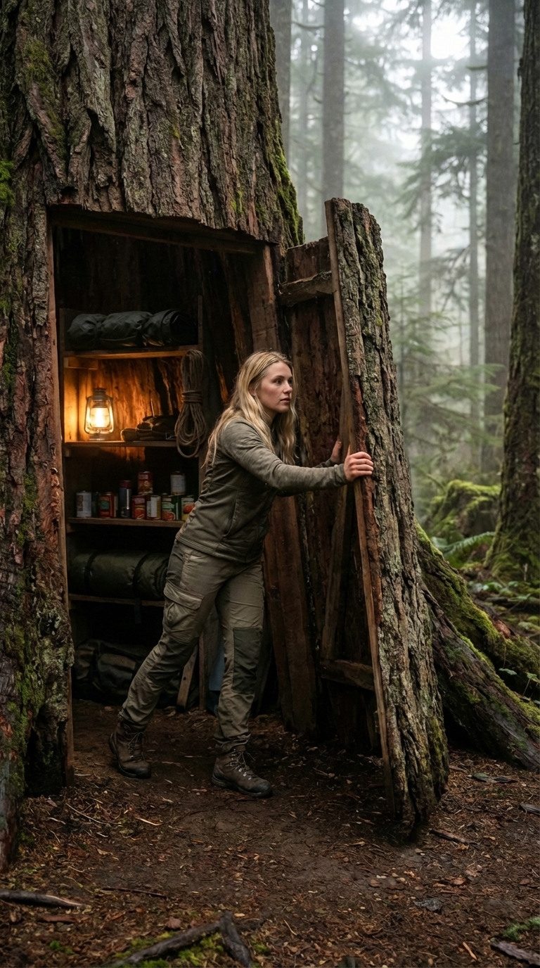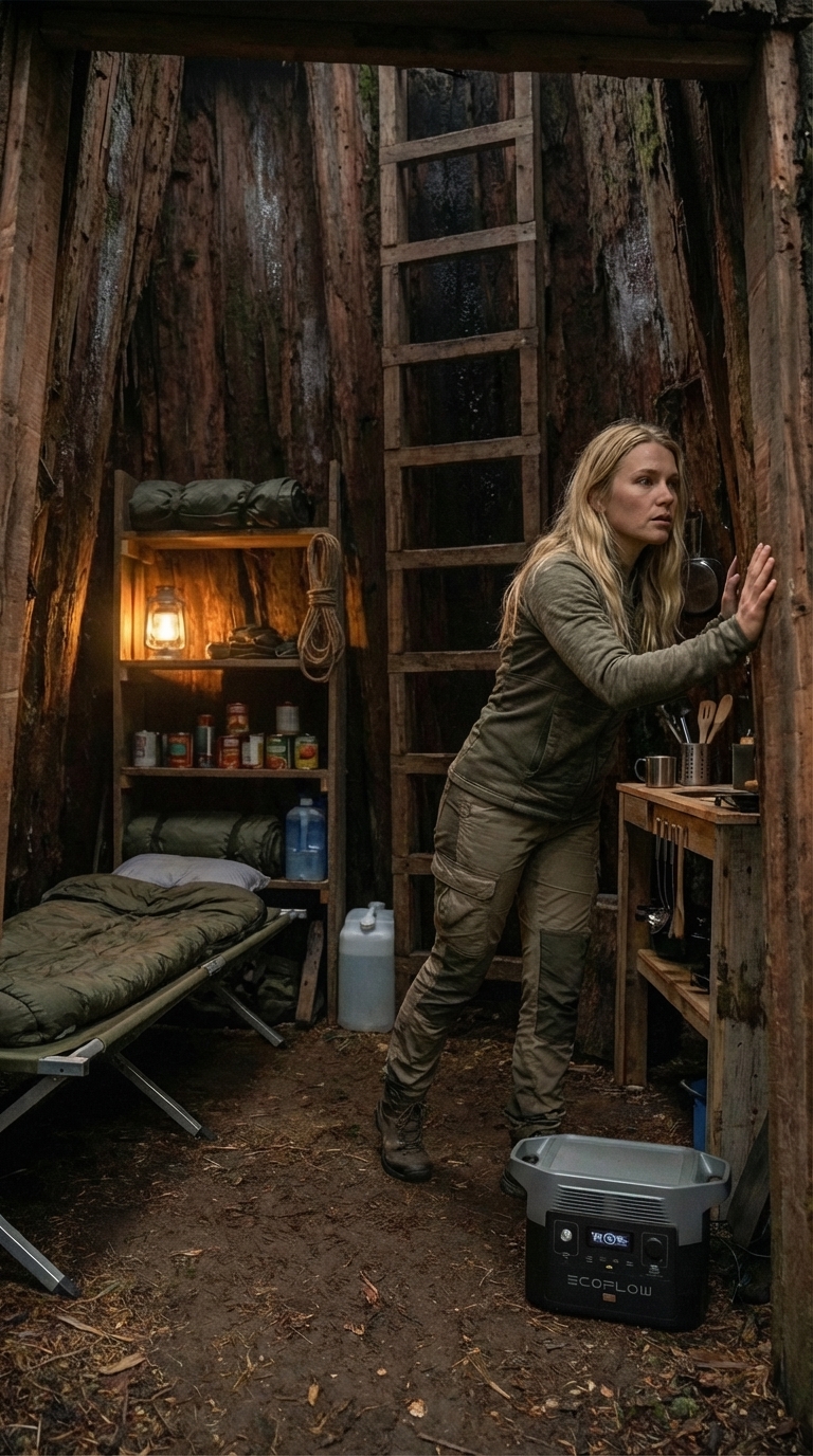 Designed for resilience and practicality, this interior transforms a hidden space into a reliable survival hub. Whether used for emergency shelter or extended off-grid stays, it delivers comfort, organization, and complete self-sufficiency in a discreet, nature-integrated environment.
