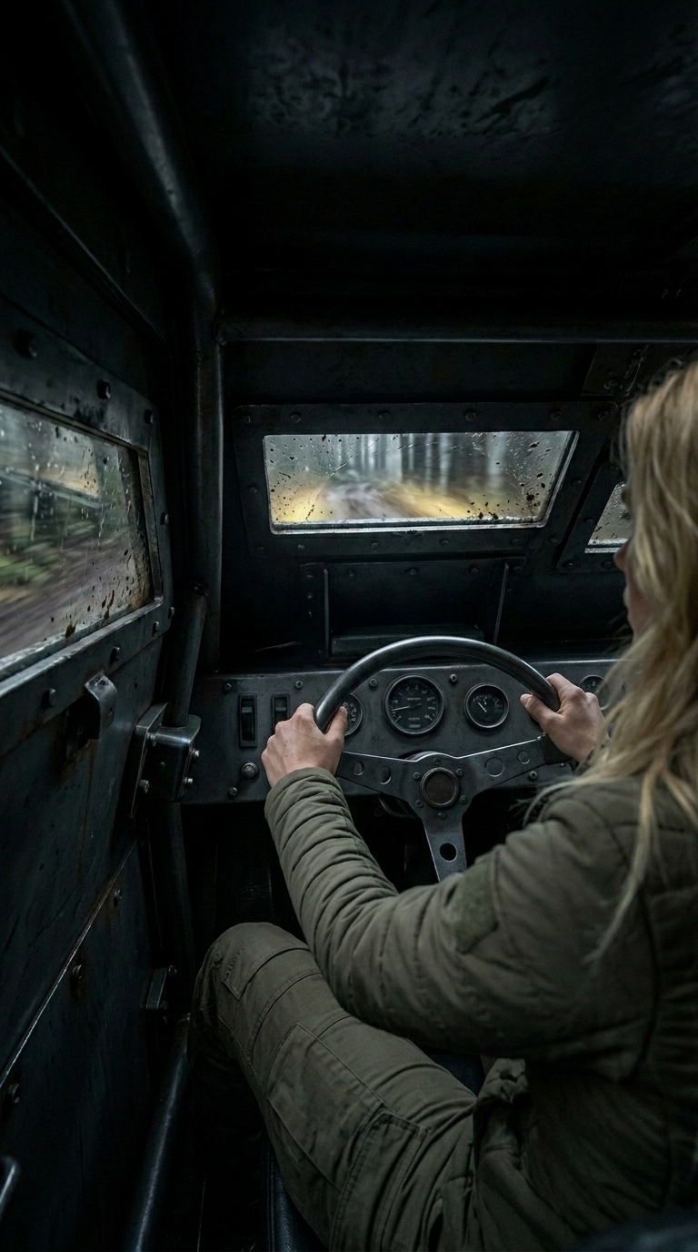 Inside, the driver is secured within a rugged cockpit featuring reinforced panels, limited-exposure windows, and a simplified control system focused on reliability. The enclosed structure offers protection from debris, weather, and external threats while preserving visibility through narrow armored viewports.