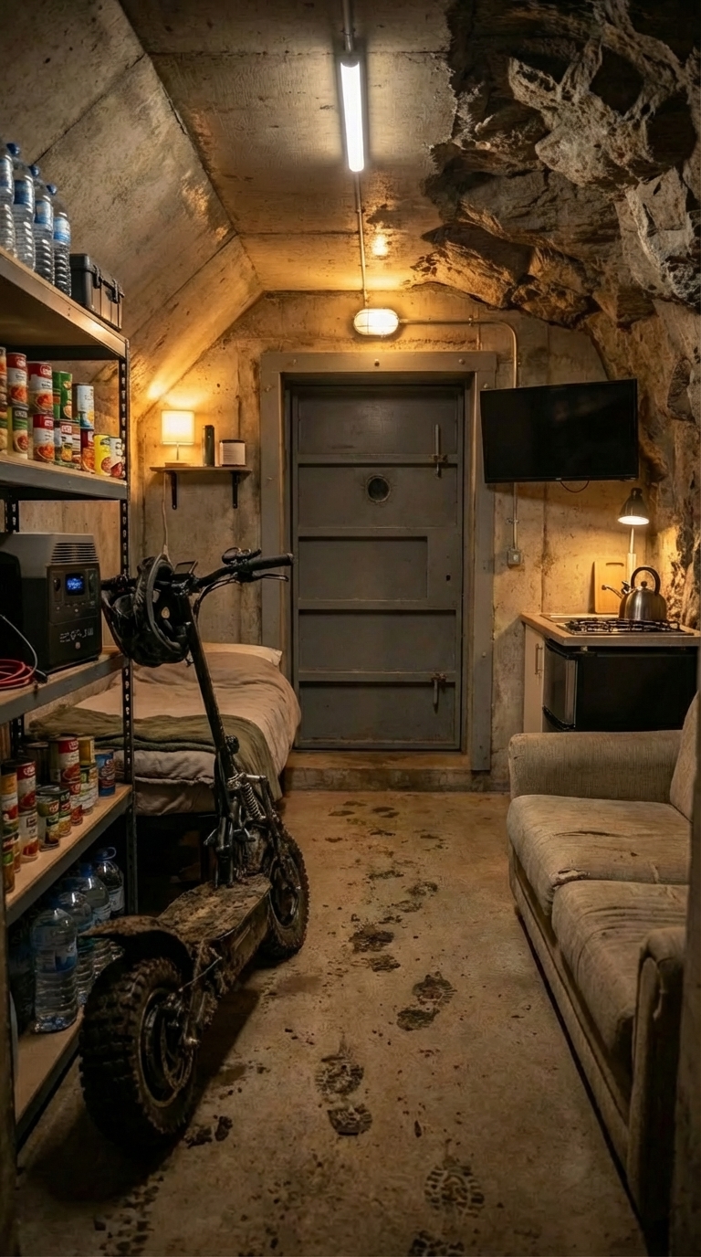 This type of interior is ideal for hidden underground shelters where space is limited but functionality is critical. It balances simplicity with survival efficiency, creating a reliable and practical environment in a fully concealed location.
