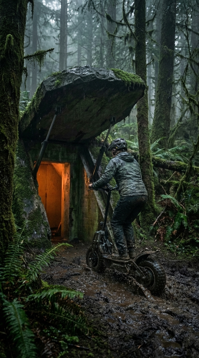 The presence of an off-road electric scooter inside highlights mobility and fast access in and out of the bunker, especially in difficult terrain conditions such as mud or dense forest.