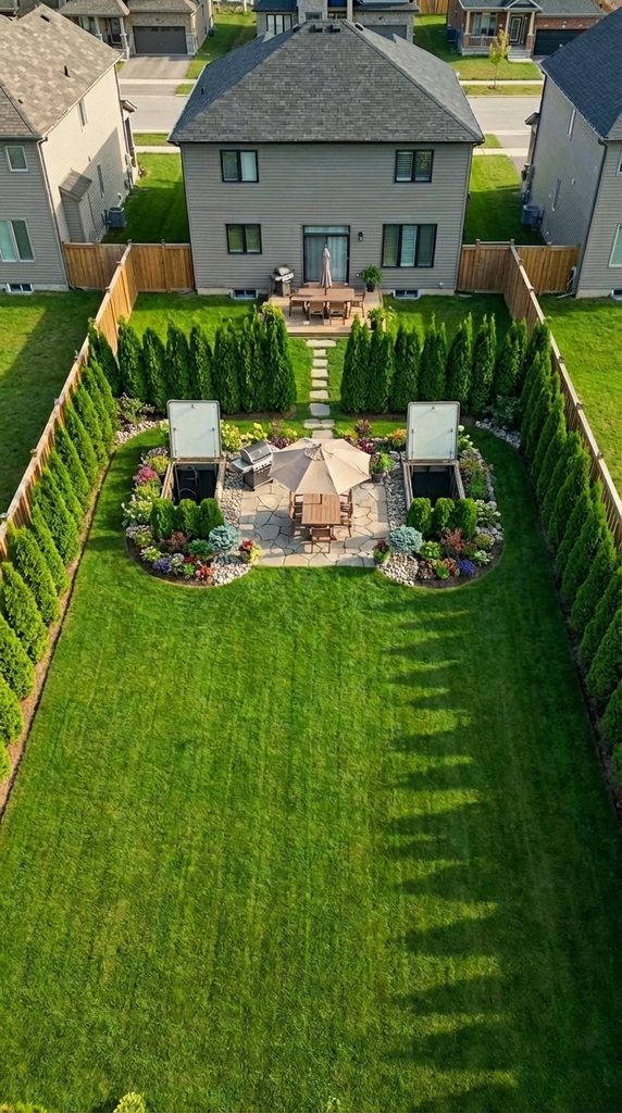 Tall hedges and greenery create privacy and frame the backyard, further blending the entrances into the environment. From both ground level and aerial view, the area appears as a standard, well-maintained yard with no visible signs of underground construction.