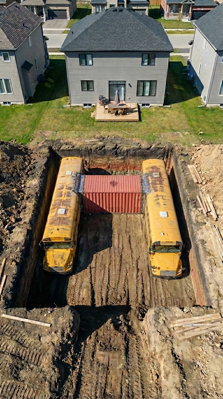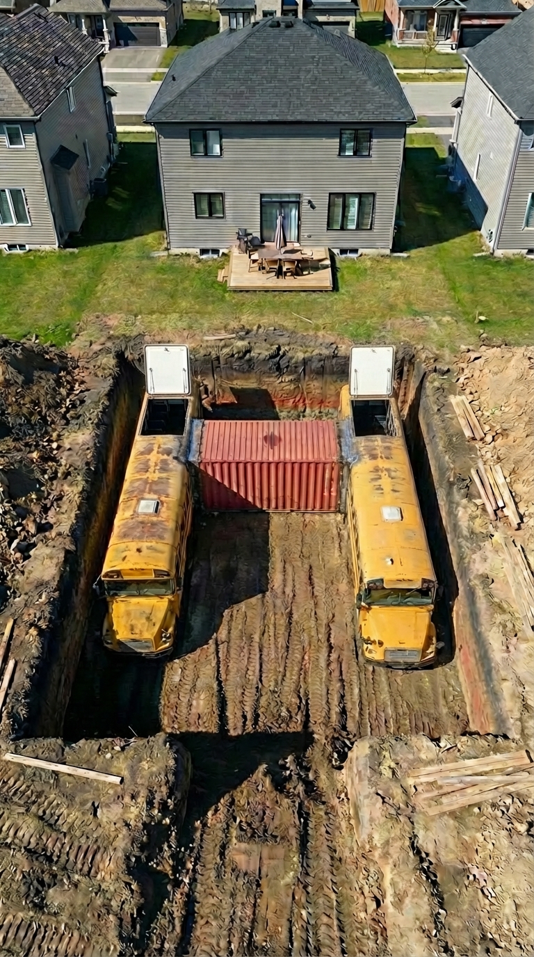 The construction of this underground bunker begins with precise site preparation and excavation. A large rectangular pit is carefully dug in the backyard, with depth and width calculated to fit both school buses and the central shipping container while allowing space for reinforcement and drainage systems. The excavation process includes leveling the base and compacting the soil to create a stable foundation.