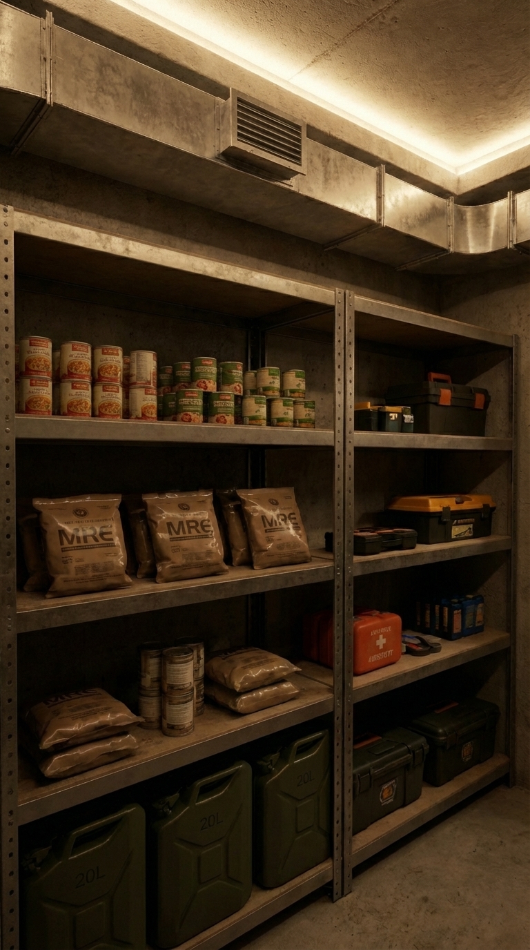 The storage zone is one of the most important parts of the bunker. Heavy-duty metal shelving lines the walls, filled with long-term food supplies such as canned goods, dry rations, grains, and MRE packages. Everything is organized by category and shelf life, allowing quick access and proper rotation of supplies. Large water containers are placed on lower levels for stability, ensuring a reliable supply of drinking water for extended periods.