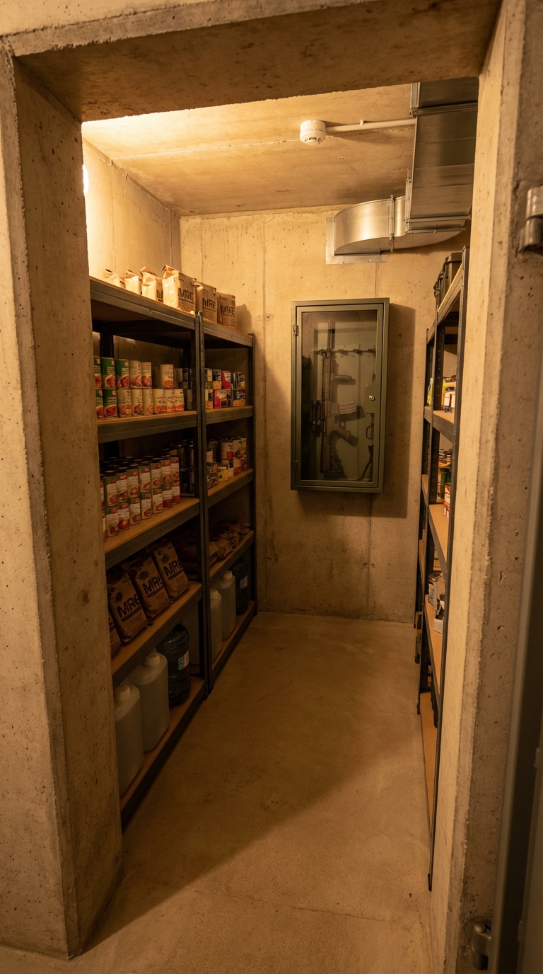 The interior of this underground bunker is designed with a clear priority — long-term survival, reliability, and efficient use of space. Every area is carefully planned to combine storage capacity, functionality, and comfort while maintaining a strong, secure environment built from reinforced concrete.