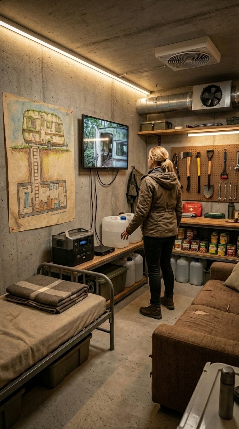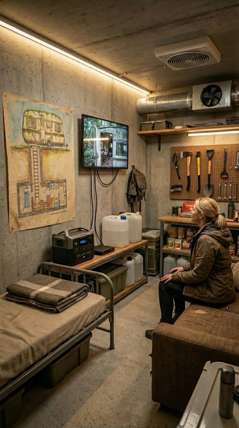 Overall, this bunker interior is not just a shelter, but a fully functional survival system. It combines storage, security, energy independence, and livability into one compact underground structure designed to support people safely for extended periods.