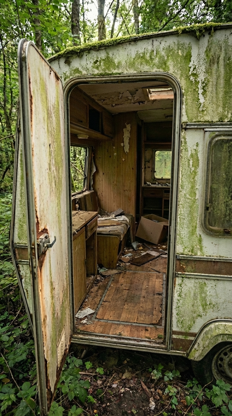 At first glance, this old, moss-covered trailer deep in the forest looks completely forgotten. Rusted metal, broken wood panels, and years of decay make it blend naturally into the surroundings. It’s the kind of place most people would walk past without a second thought. But behind this abandoned shell lies a carefully concealed underground bunker entrance.