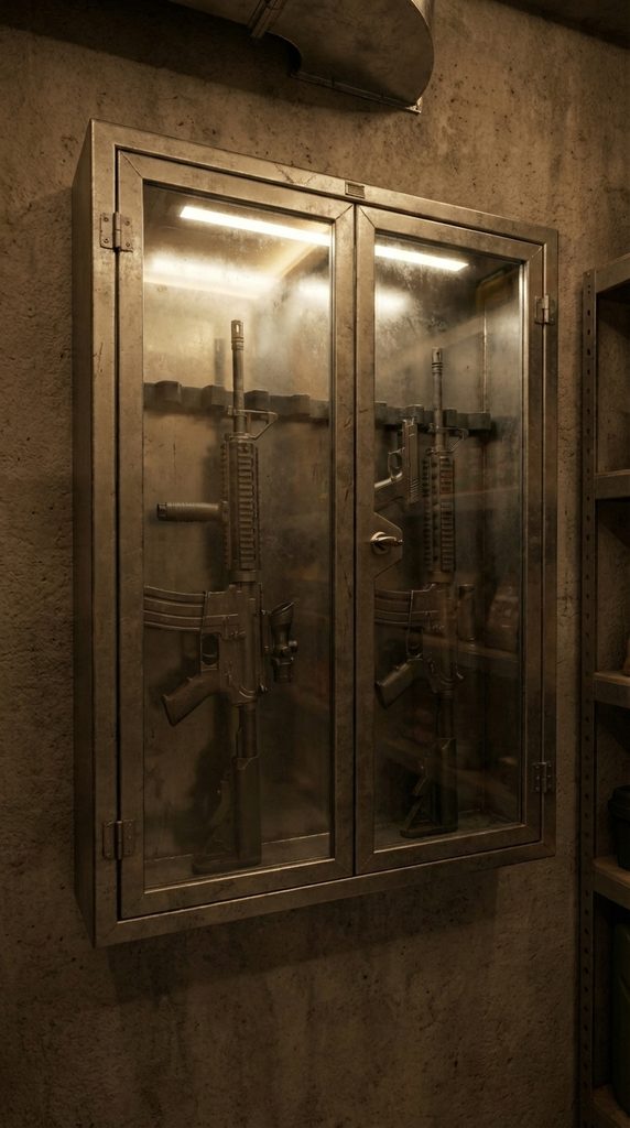 Next to the food storage, a secured equipment section includes a reinforced cabinet for critical tools and defensive gear. This area is built with thick metal framing and lockable doors, ensuring both safety and controlled access. The placement inside the bunker keeps everything protected from moisture and environmental damage.