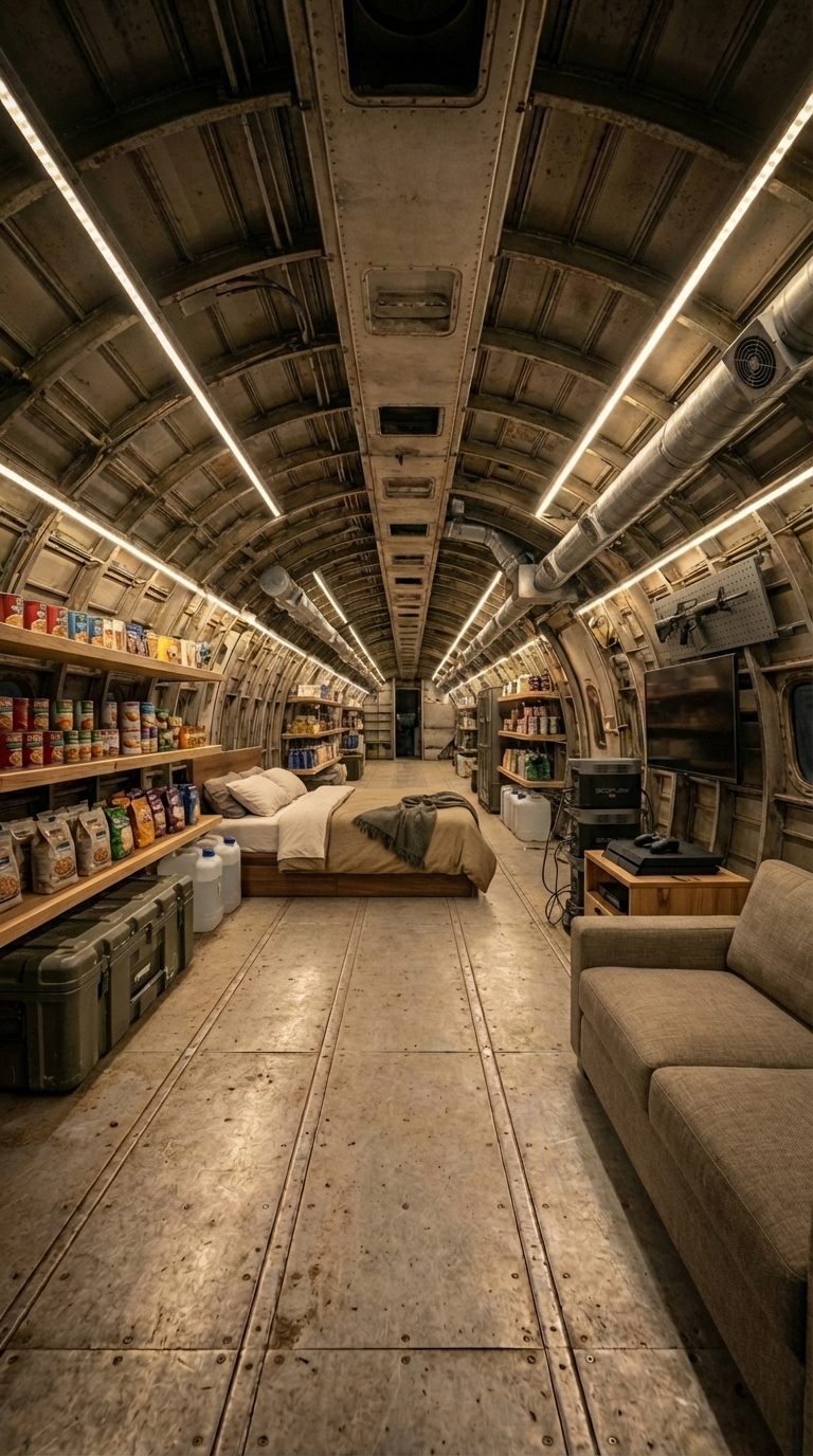 The aircraft fuselage serves as the main underground structure. Its original shape provides a naturally reinforced, tunnel-like layout that is ideal for long-term use. Inside, the space has been carefully redesigned into a livable environment. One section functions as a sleeping and rest area, while another is dedicated to storage, filled with preserved food, water containers, and essential supplies for extended autonomy.