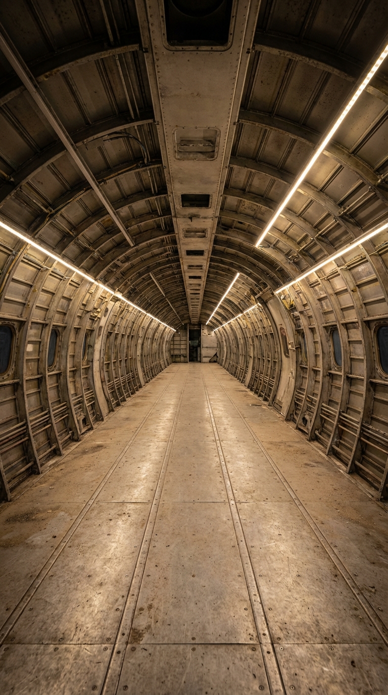 Lighting has been upgraded with continuous LED strips along the curved walls, creating a clean and well-lit interior while preserving the industrial character of the aircraft. The metal structure, rivets, and original framework remain visible, giving the bunker a raw, authentic atmosphere.