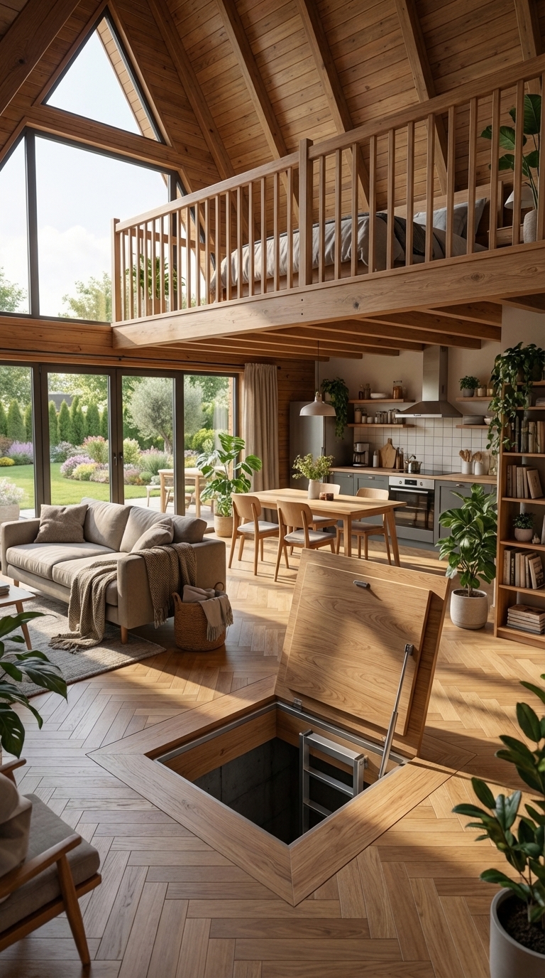 Above ground, the house appears completely ordinary — a bright, modern living space with natural wood finishes and large windows. A hidden floor hatch provides direct access to the bunker below, seamlessly blending security with everyday comfort.