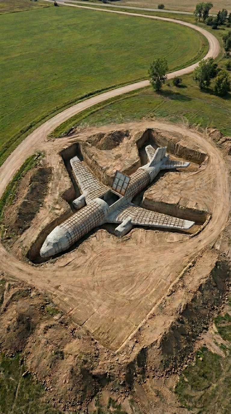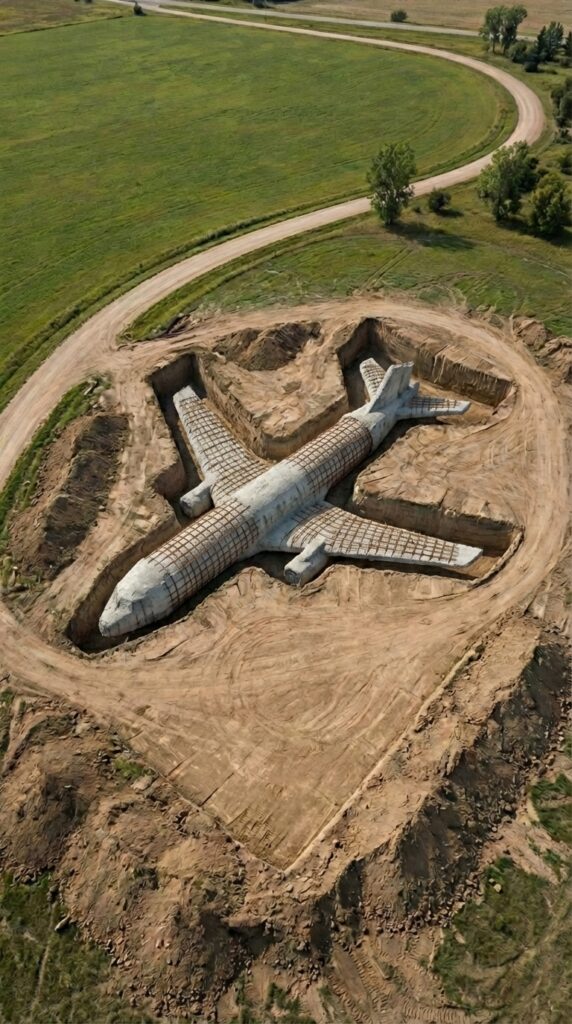 The process began with large-scale excavation in a remote rural field. A deep pit was shaped to match the dimensions of the aircraft, allowing the fuselage and wings to sit partially below ground level. The structure was then reinforced with concrete and steel, ensuring durability and protection from external conditions. The wings were embedded into the surrounding soil, adding stability and natural insulation.