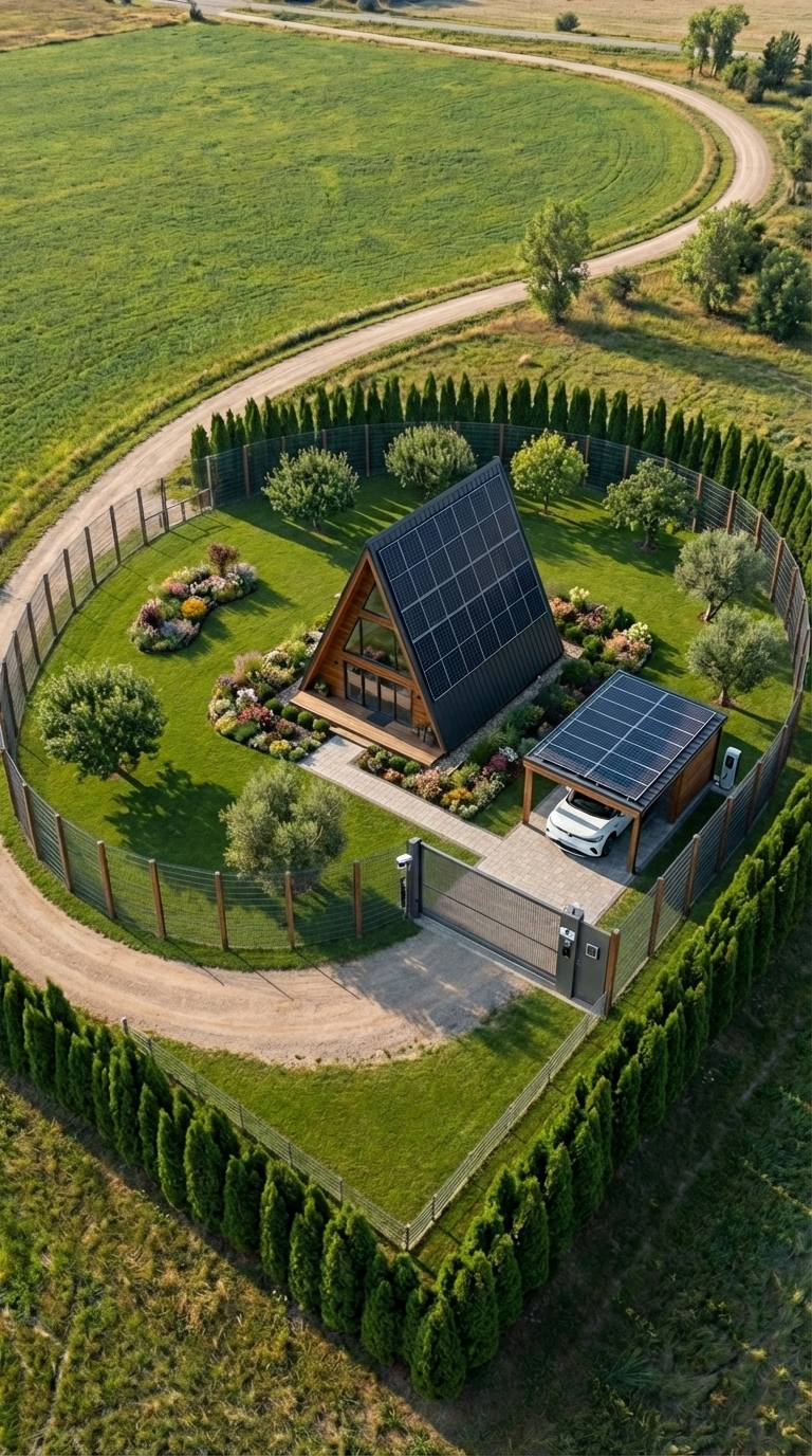 A small parking area with a covered carport integrates seamlessly into the layout, while pathways and garden elements enhance both practicality and visual appeal. Everything above ground is designed to appear completely ordinary — a quiet, self-sufficient home in a rural setting.