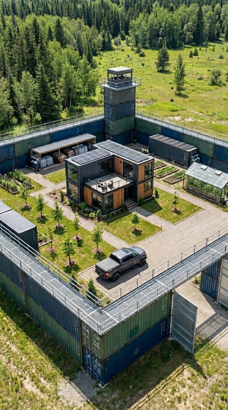 In the middle of the forest, we found the perfect place to start over. Using shipping containers as a foundation, we built a secure compound with high reinforced walls and a watchtower overlooking the entire property. What once were simple industrial structures became the base of a fully protected and private living space.