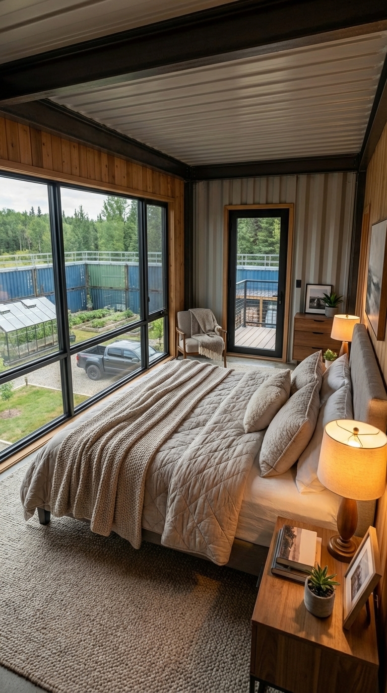 From the outside, the house looks simple and minimal, with a combination of metal and natural wood panels that soften the industrial feel. Solar panels installed on the roof provide a steady source of energy, supporting a fully independent lifestyle without relying on external systems.