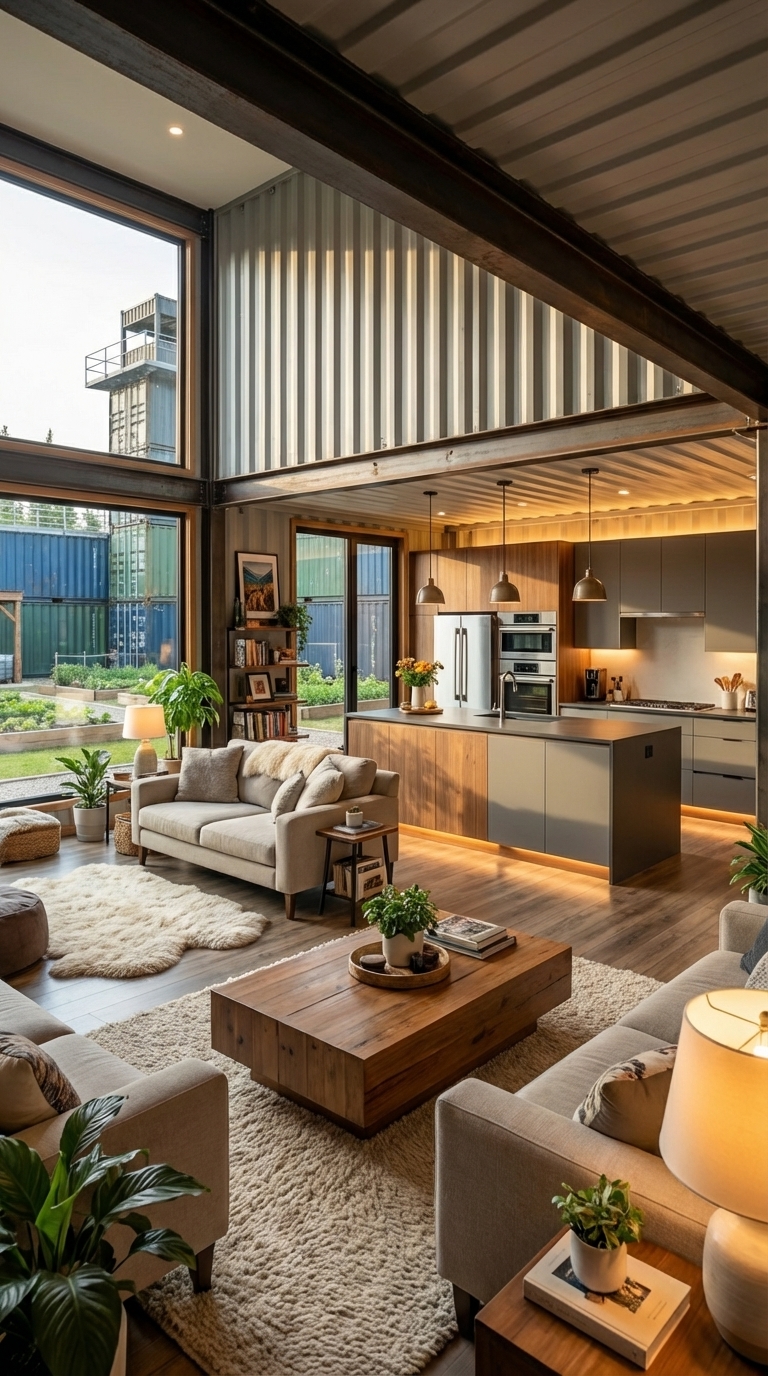 Inside, the space opens into a bright and spacious living area with large panoramic windows. Natural light fills the room, creating a warm atmosphere that contrasts beautifully with the strong container structure. The open-plan layout connects the living room and kitchen, making the space feel larger and more functional.