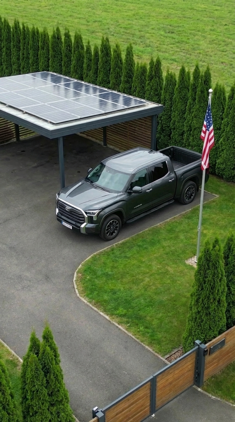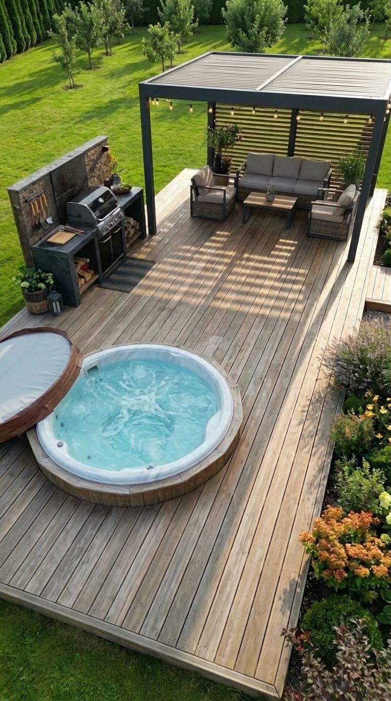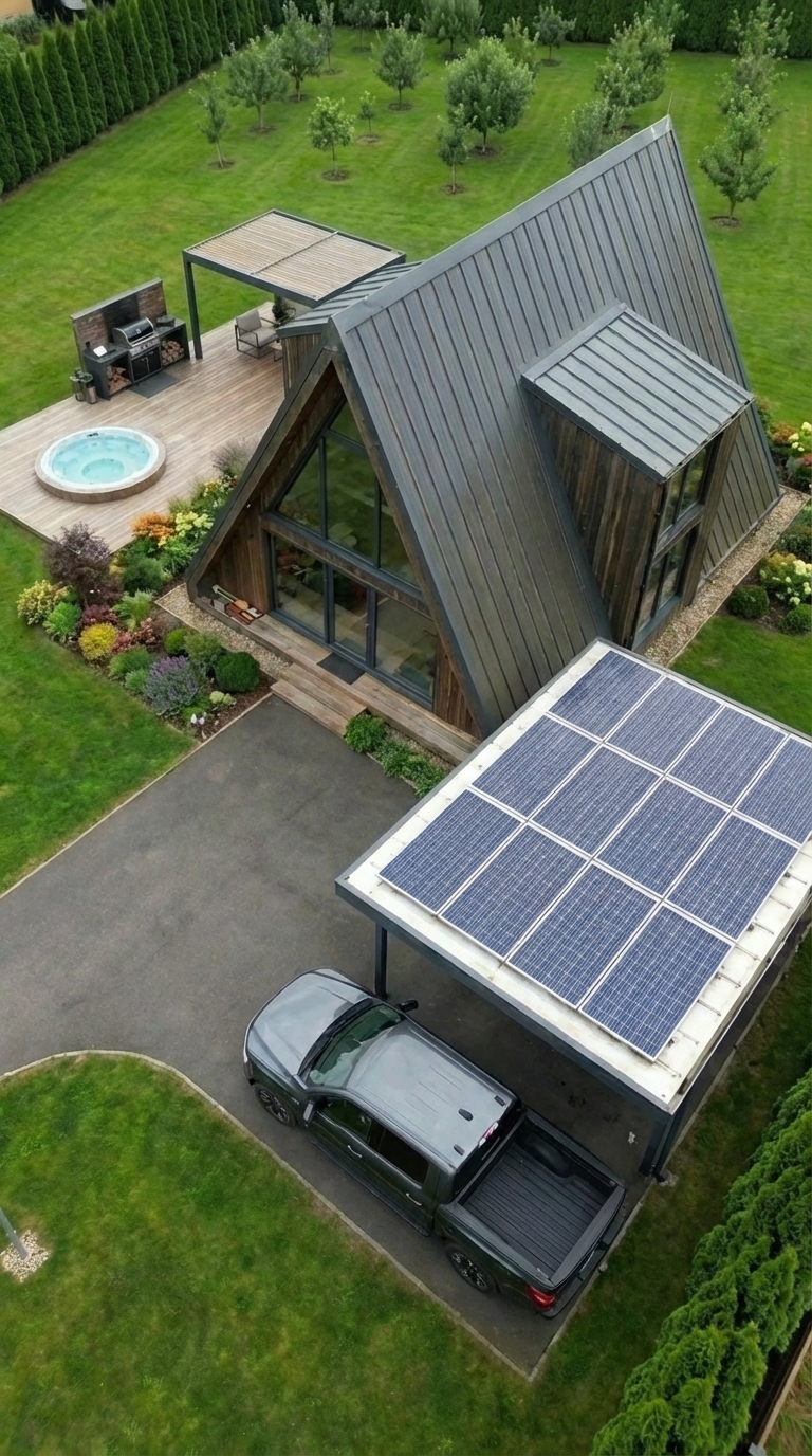 The outdoor area was designed to be both practical and relaxing. We built a lounge zone where we spend evenings, added a hot tub for comfort, and planted fruit trees that will grow with time. A small garden provides fresh food, and solar panels ensure that the entire system remains independent from external energy sources.