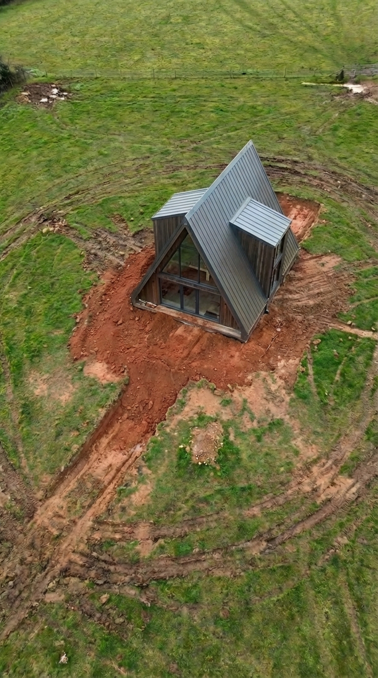As the construction moved forward, the project slowly transformed from an idea into a fully functional living space. The house above ground became the visible part of our new life — simple, calm, and deeply connected to nature. Large windows bring in natural light throughout the day, while the A-frame design keeps the structure efficient and warm in any season.