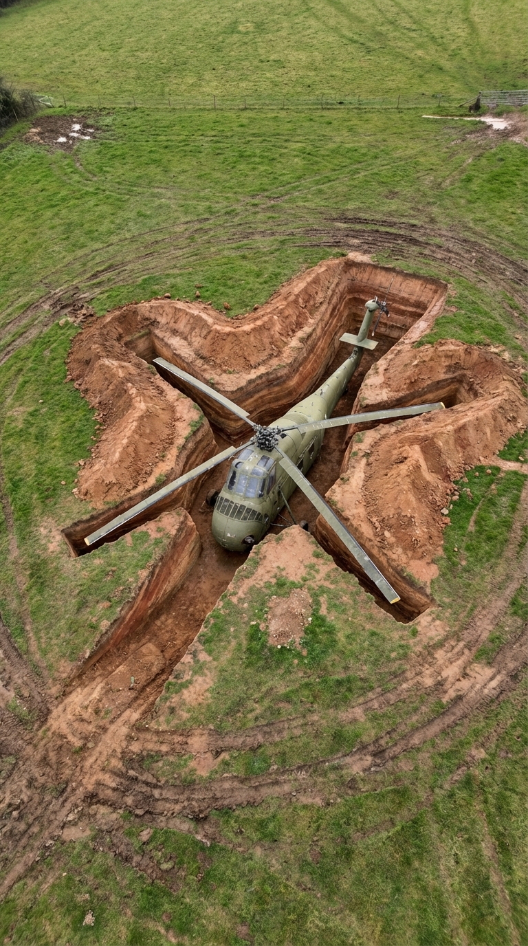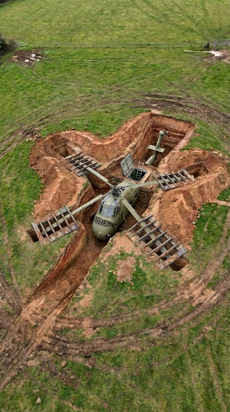 Once the excavation was ready, the helicopter was carefully placed inside and secured. It was no longer a machine meant to fly, but it was far from useless. This was the moment when the idea truly came to life — turning a retired aircraft into the core of a fully functional underground bunker.