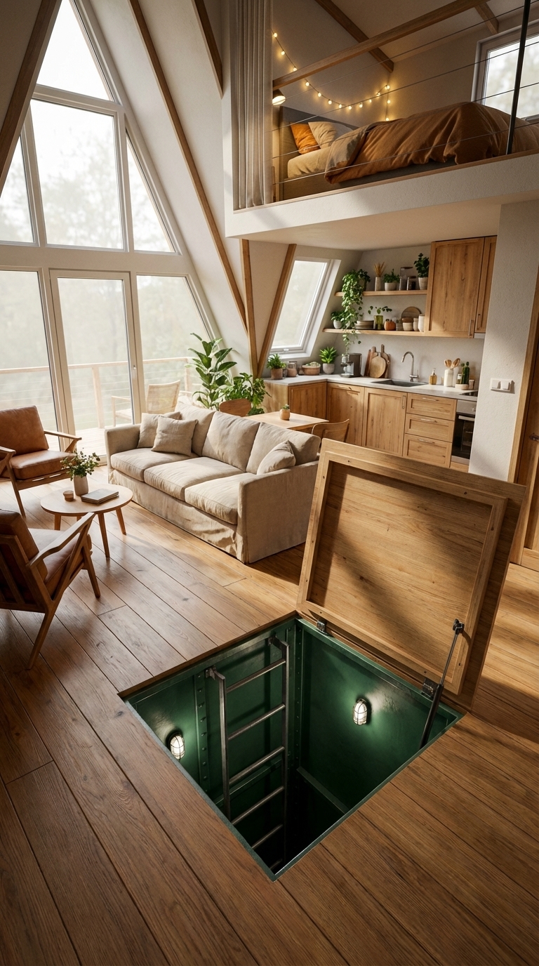 Access to the bunker is hidden inside the house through a reinforced floor hatch with a ladder leading down. From the outside, nothing reveals what is below, but inside it is a fully equipped underground system combining survival functionality with a personal aviation experience.