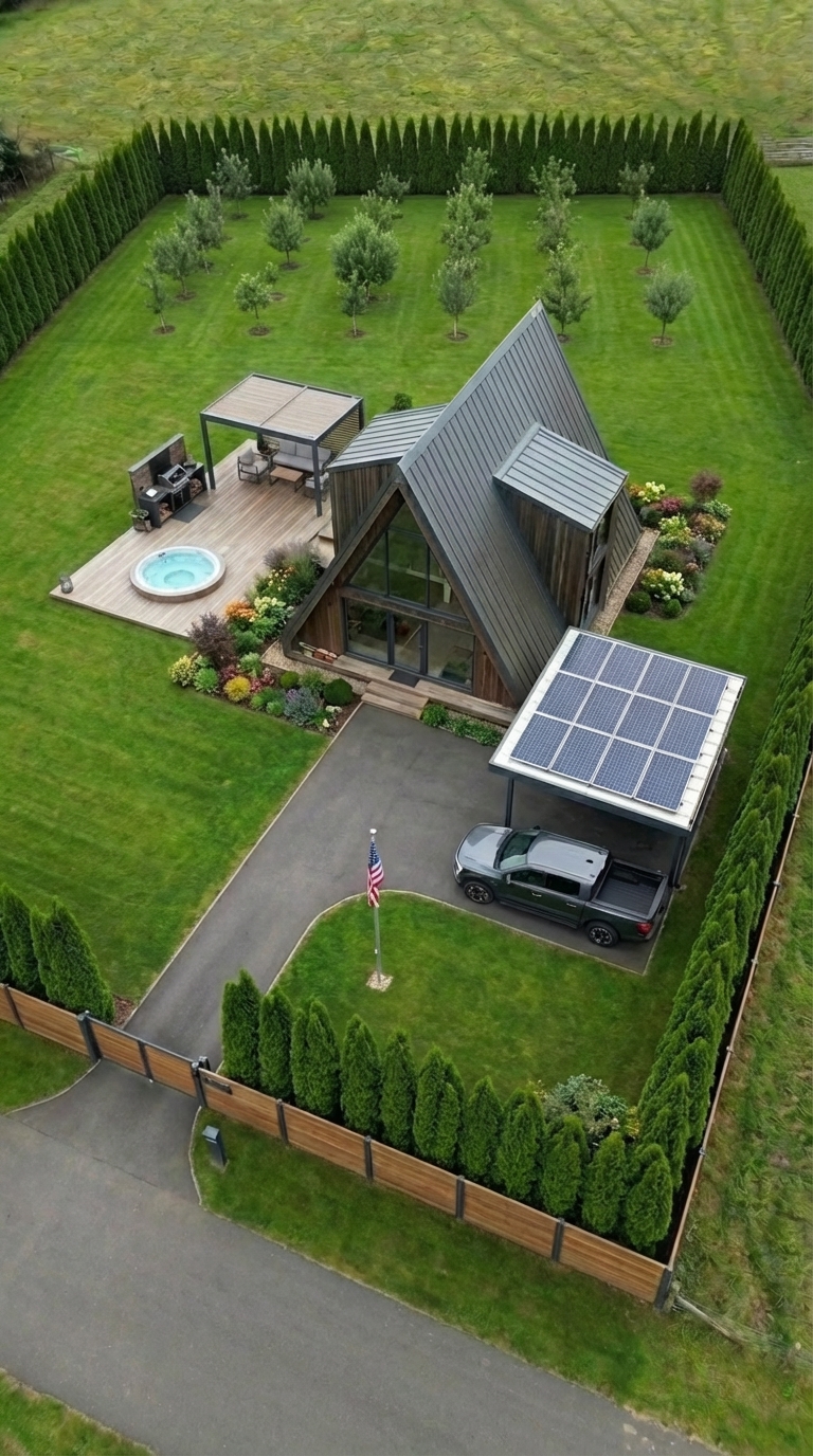 Above it, we built a modern A-frame house that blends naturally with the landscape. From the outside, it looks like a simple and cozy home, but beneath it lies a completely different world. Around the house, we created a comfortable outdoor space — a lounge area for relaxing evenings, a hot tub for cold nights, solar panels for energy independence, and a small orchard with fruit trees that adds both beauty and practicality to the land.