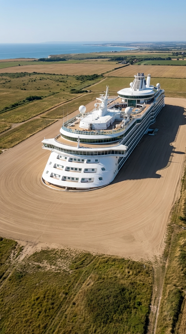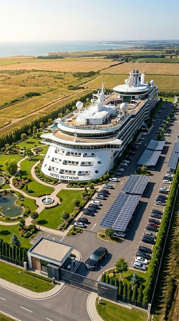 Around the liner, we built a secured perimeter with controlled access, surveillance systems, and autonomous infrastructure. The surrounding area was redesigned into a fully functional environment with parking zones, landscaped gardens, water features, and solar panel systems to support energy independence.