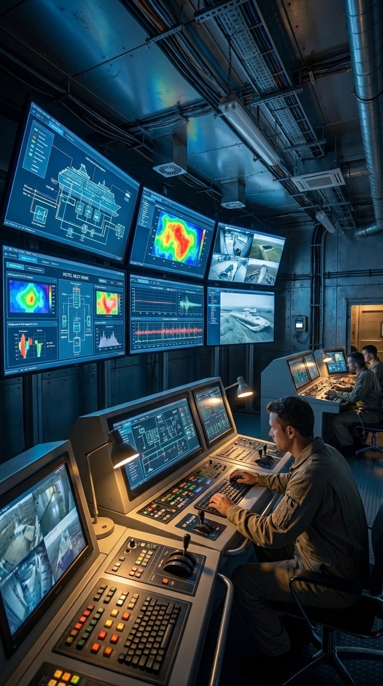 This is the brain of the entire complex. From here, every system is monitored in real time — energy production, water levels, air quality, security cameras, and perimeter sensors. Multiple large screens display live data and external views, allowing full control over the environment. In critical situations, this room becomes the decision-making hub that keeps everything running safely and efficiently.