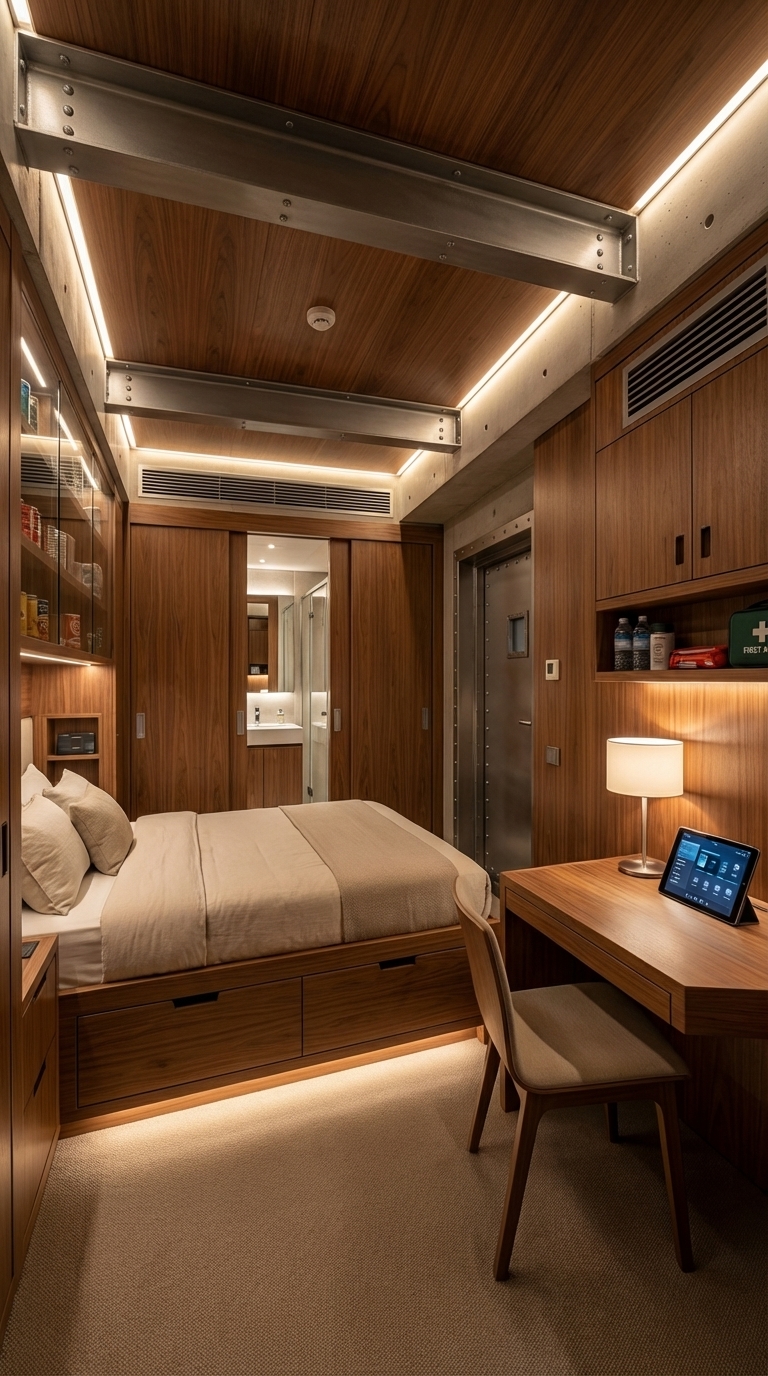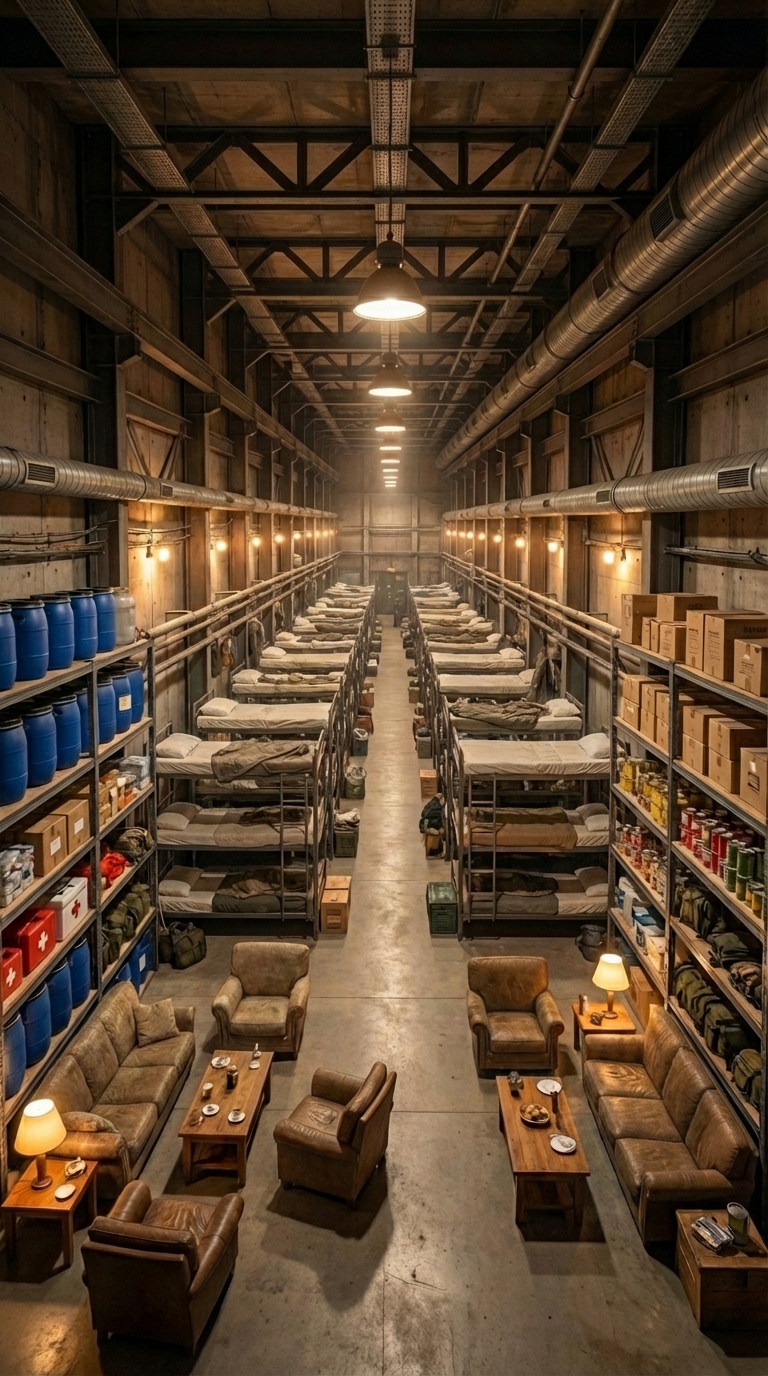This area is built for endurance. It includes large ????? supplies, organized shelving systems, water containers, and emergency equipment. Alongside storage, there are extended sleeping areas designed to accommodate additional people if needed. Everything is arranged for efficiency, quick access, and maximum capacity.