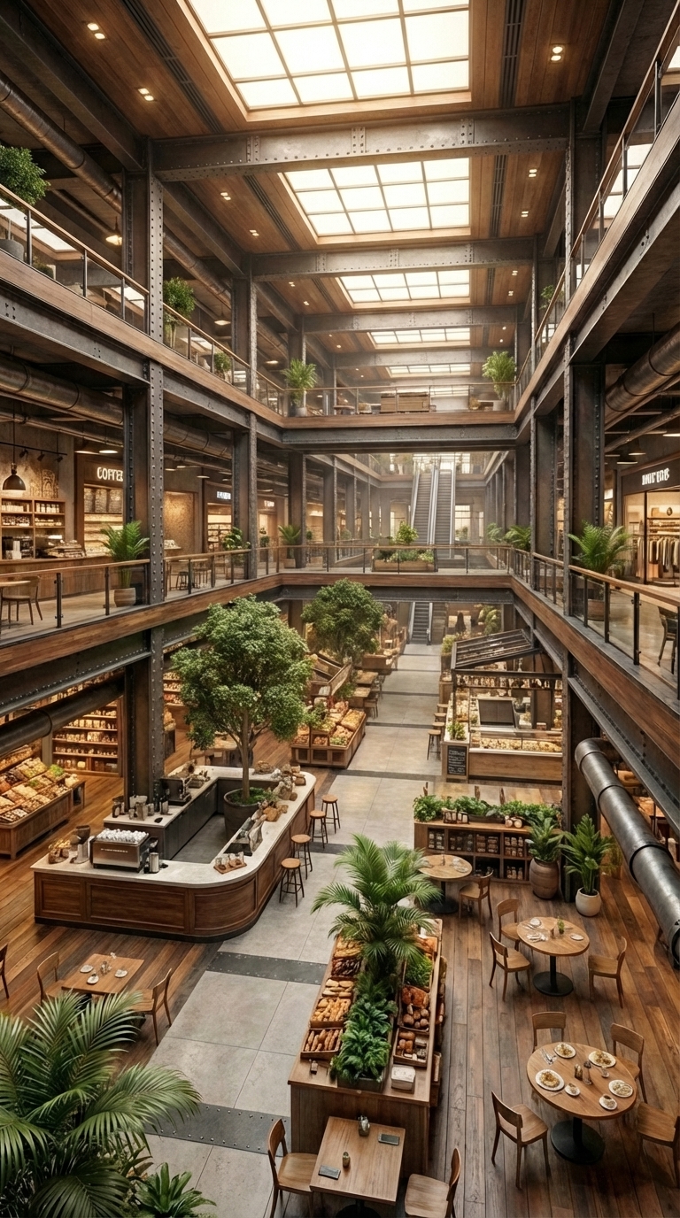 At the heart of the liner is a spacious multi-level zone designed for daily life. It combines a food market, dining space, and social area into one open environment. Fresh products from internal storage and growing zones are distributed here. The design focuses on comfort and normality, making it feel less like a bunker and more like a modern indoor community space.