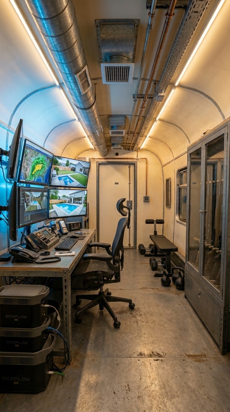 To make the bunker truly livable, we included a full bathroom system and a high-tech command center fitted with surveillance cameras and monitoring equipment. There is also a secure storage area designed for critical tools and equipment. However, the most unique feature is the main cabin — a dedicated entertainment zone where we installed a professional-grade train simulator, turning the original streetcar into the ultimate immersive gaming experience.