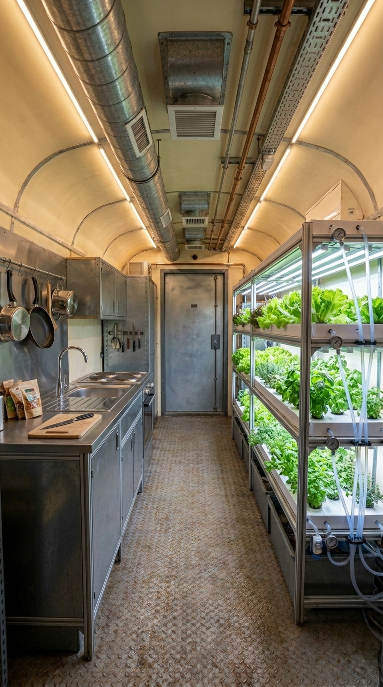 The kitchen area is one of the most advanced sections. Stainless steel surfaces, organized storage, and a fully operational hydroponic farming system allow fresh food production inside a completely enclosed environment. Rows of green plants grow under artificial lighting, creating a sustainable food source independent of external conditions. This is not just a kitchen — it is a closed-loop food production system.