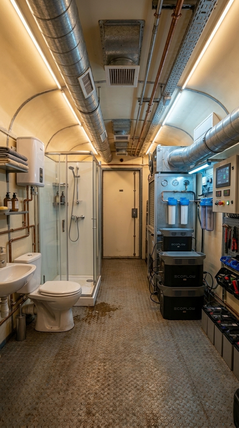 Moving deeper, the bathroom module demonstrates how comfort was not sacrificed for functionality. A complete shower system, water heater, filtration units, and proper sanitation infrastructure make it possible to maintain normal hygiene standards underground. Ventilation ducts run across the ceiling, maintaining consistent airflow throughout the entire structure.