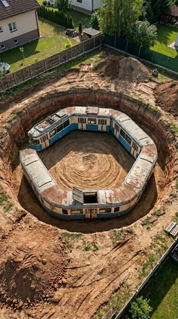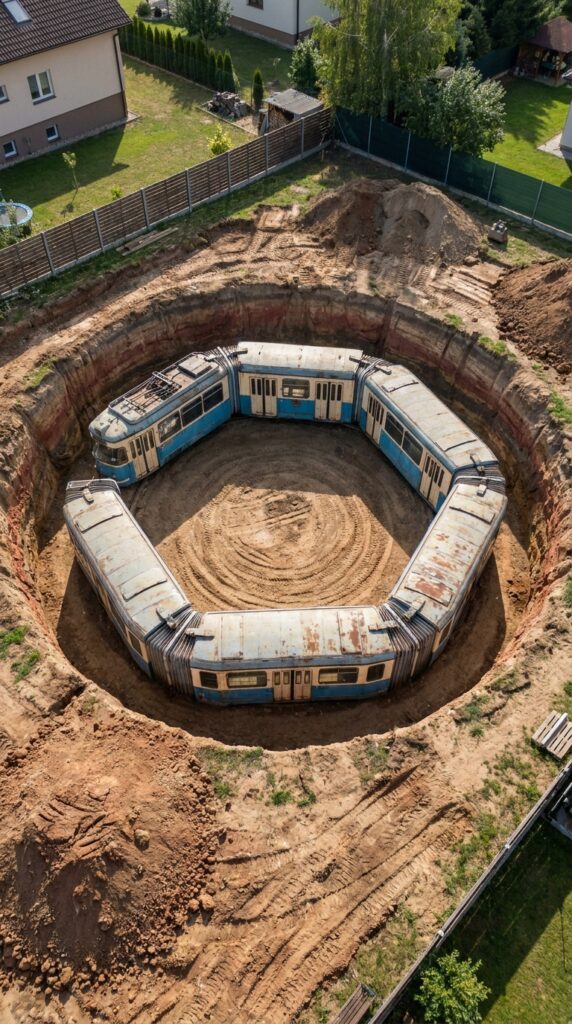 The project began with a massive excavation, creating a deep circular pit reinforced for long-term structural stability. The streetcar was carefully lowered into place and arranged in a ring-like configuration, forming a unique and functional layout. Once positioned, we reinforced the entire structure and installed two secure hatches to ensure safe and controlled access.