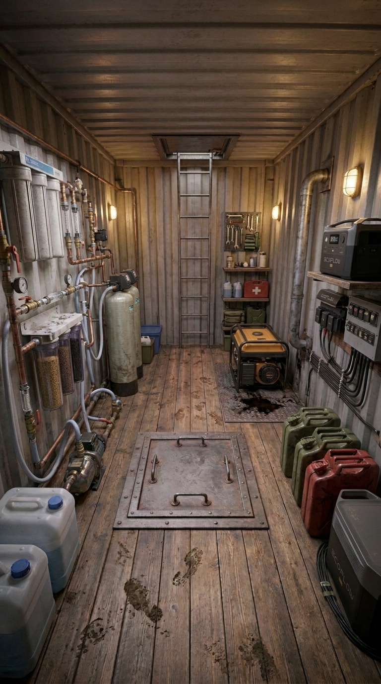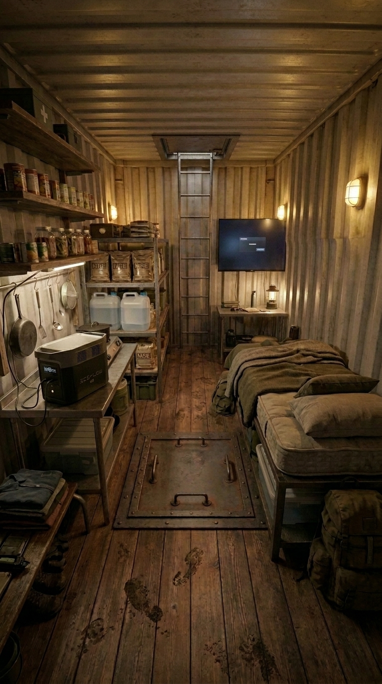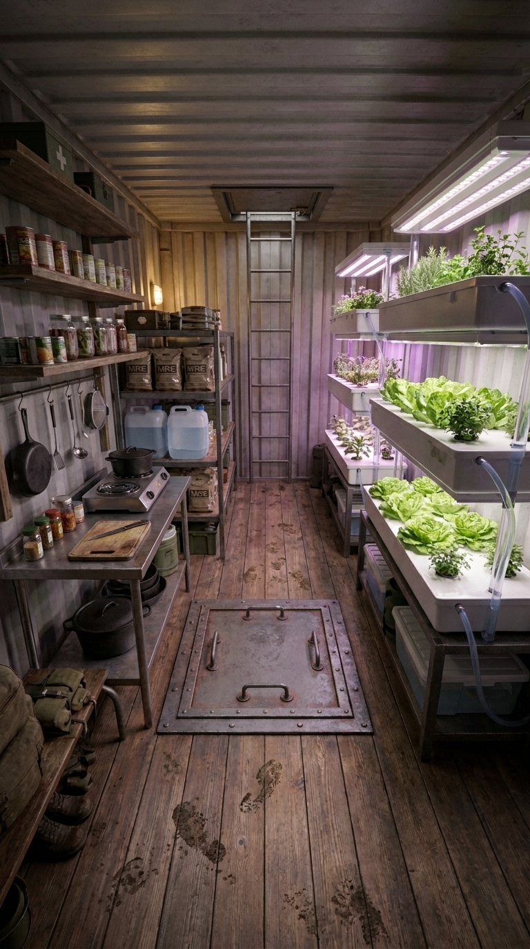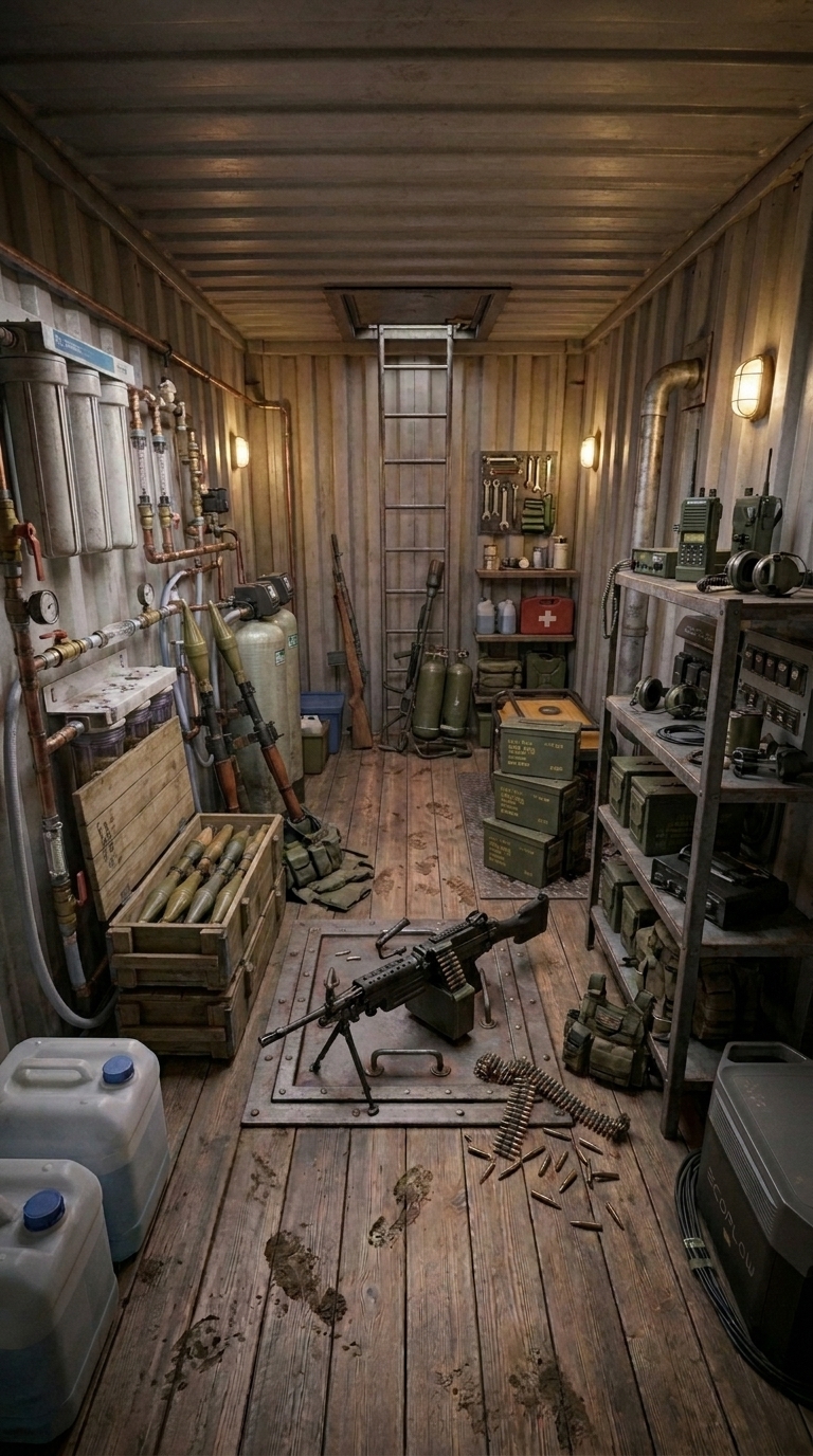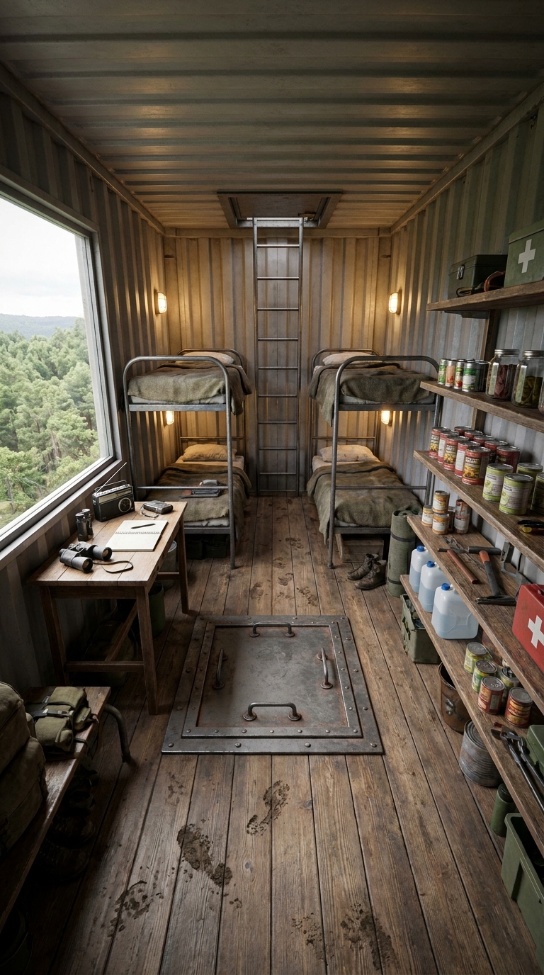 Inside, the bunker is divided into functional zones that maximize efficiency and comfort. There are dedicated sleeping quarters, a fully equipped kitchen area, and organized storage for essential supplies. A hydroponic growing system allows fresh food production year-round, even in harsh climates. The water filtration system ensures a continuous supply of clean drinking water, while multiple power sources, including solar panels and portable energy stations, provide reliable electricity without dependence on the grid.