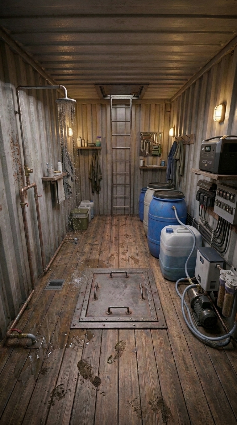 The second zone is the hygiene area, designed around a practical shower system. Water barrels, filtration units, and pump systems are connected to provide a stable flow even in harsh conditions. The setup supports both storage and recycling of water, making it suitable for off-grid living. The space is minimal but functional, ensuring basic comfort and cleanliness during long stays.