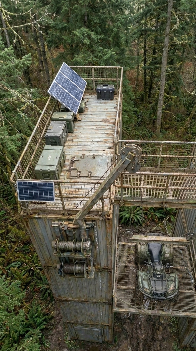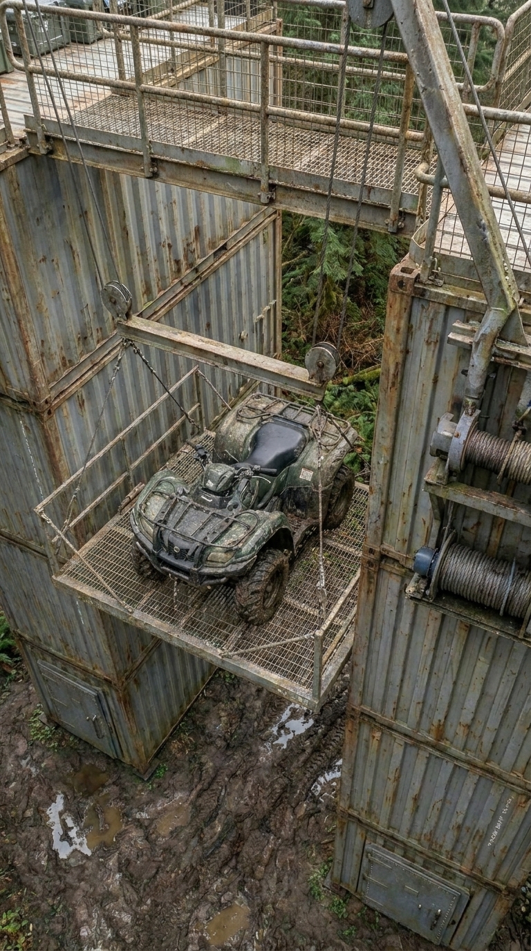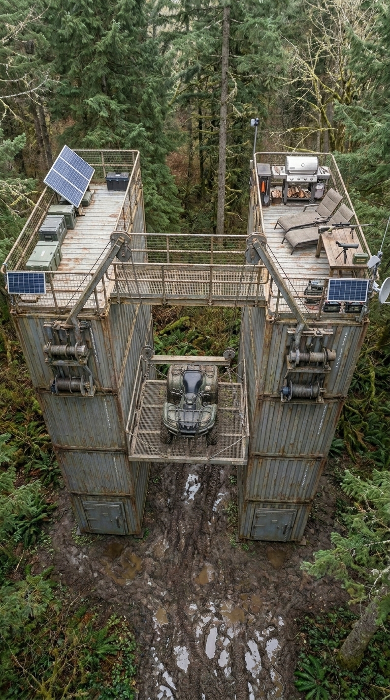 A key feature of this survival bunker is the reinforced lift system designed specifically for safely storing and accessing an all-terrain vehicle. Suspended between the container towers, the platform is engineered with heavy-duty steel cables, industrial pulleys, and a stabilized frame to ensure maximum reliability under load. This elevated lift keeps the vehicle protected from mud, flooding, and ground-level threats while maintaining quick access when mobility is required.